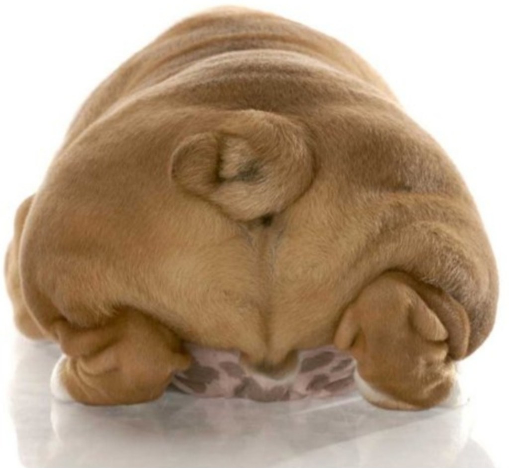 Around the tail is another trouble area…. the corkscrew shape of a bulldog’s tail creates a fold known as a “tail pocket”, which is prone to bacterial build-up and infection.